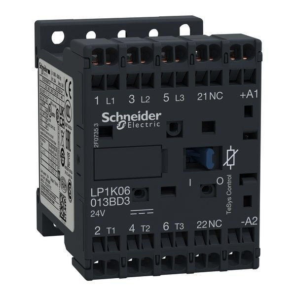 Leistungsschütz TeSys LP1K. 3 polig, 3 Schließer. Zusätzliche Hilfskontakte- 1 Öffner, Bemessungsbetriebsleistung bei AC-3, 400 V 2.2 kW, Bemessungsbetriebsstrom Ie bei AC-3, 400 V 6 A, Spule 24 V DC. Abmessung (BxHxT) 45x58x57 mm, Gewicht 0,225 kg. Kategorie AC-3, AC-4. integrierte bidirektionale Amplitudenbegrenzerdiode. Einfache Maschinensteuerung in Industrie, Infrastruktur und Gebäudeanwendungen. Einfach zu bedienende Schnittstelle für elektronische Geräte (SPS). Zertifizierungen nach UL, CSA. Produktstandards gem.