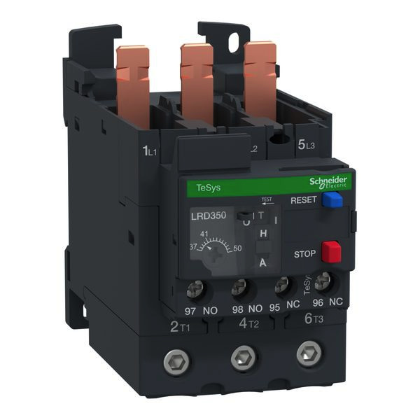 TeSys LR ? 3-polige Motorschutzrelais. Motorschutzrelais, Federzuganschluss. Einstellbereich_Relais 37-50 A, Max. Grösse aM 63, Max. Grösse BS88 100, Max. Grösse gG 100, MTZ 01, Verwendung D40A-D65A. Temperaturkompensiert mit Differentialschutz. Mit manueller oder automatischer Rückstellung. Auslöseklasse 10 A. Schraubklemmen. Montage direkt unter das Schütz. Auf der Gerätefrontseite Wahl der Rückstellung manuell oder automatisch. Roter Taster zur Auslösung der Funktion -Test?. Blauer Taster für die Funktion -Aus? und -Manuelle Rückstellung?. Gelbe mechanische Anzeige erscheint bei Auslösung des Relais. Hilfsschalter 1S+1Ö.