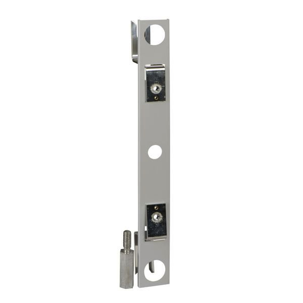 Es handelt sich um einen Umbausatz für die 185mm-Sammelschienen-Direktkontaktmontage für einen 3-poligen FuPacT ISFL160 Sicherungslasttrennschalter. Mit diesem Umbausatz können die 100mm-Standardbefestigungsmittelpunkte auf 185mm-Befestigungsmittelpunkte angepasst werden. Die elektrische und mechanische Verbindung zu den Stromschienen wird durch einen Satz von Schrauben und Muttern sichergestellt. Die elektrische und mechanische Verbindung des Geräts mit dem Umbausatz 100/185mm wird durch drei Schrauben sichergestellt.