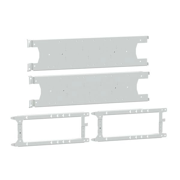 PrismaSeT P. Montageplatte für fünf 3- oder 4-polige ComPacT NSXm bis 160 A mit Kipphebelantrieb oder direktem Drehantrieb in vertikaler Einbaulage und Festeinbautechnik. mit einer Höhe von 8 Moduleinheiten für Schaltschränke mit einer Breite von 650 mm. Pulverbeschichtet in RAL9003 struktur.