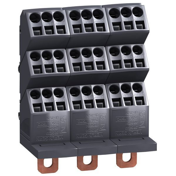 PrismaSeT P. Linergy DP Verteilerblock 3-polig mit einer zulässigen Stromstärke bis 250 A mit Einspeiseanschluss direkt an einen ComPacT NSX oder ComPacT INS bis 250 A und abgangsseitiger Anschlusskapazität für Kabel von 6 x 10 mm² pro Phase. und 3 x 16 mm² pro Phase, mit einer Bemessungsstoßstromfestigkeit (Ipk) 30 kA, Bemessungskurzzeitstrom (Icw) 8.5 kA eff./1s, Bemessungsisolationsspannung (Ui) 750 V AC, Bemessungsspannung (Ue) 690 V AC. Bemessungsstoßspannungsfestigkeit (Uimp) 8 kV, mit Schutzart IPxxB zur Montage auf einer DIN-Schiene oder auf einer Montageplatte mit einer Breite von 105 mm, einer Höhe von 138 mm und einer Tiefe von 63 mm.
