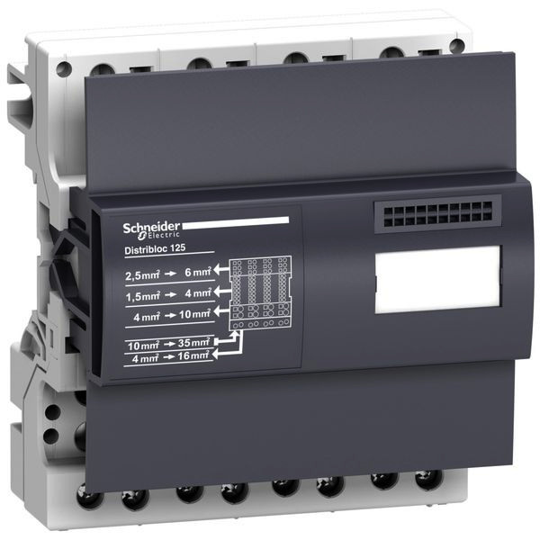 PrismaSeT P. Linergy DX Verteilerblock 4-polig mit einer zulässigen Stromstärke bis 125 A mit Einspeiseklemmen bis 35 mm² und abgangsseitiger Anschlusskapazität für Kabel von 7 x 4 mm² pro Phase und 3 x 6 mm² pro Phase und 2 x 10 mm² pro Phase und. 1 x 16 mm² pro Phase, mit einer Bemessungsstoßstromfestigkeit (Ipk) 20 kA, Bemessungskurzschlussstrom (Isc) 150 kA mit einspeiseseitigem Schutz von 150 kA (Icc), Bemessungsisolationsspannung (Ui) 750 V AC, Bemessungsspannung (Ue) 690 V AC. Bemessungsstoßspannungsfestigkeit (Uimp) 8 kV, mit Schutzart IPxxB zur Montage auf einer DIN-Schiene oder geschraubt auf einer Montageplatte. mit einer Breite von 6 Moduleinheiten (18 mm), einer Höhe von 127 mm und einer Tiefe von 48 mm.