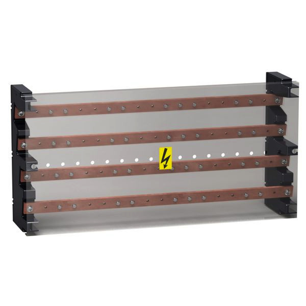 PrismaSeT P. Linergy BS Etagenklemmenblock 4-polig mit einem Sammelschienenquerschnitt von 32 x 8 mm und einer zulässigen Stromstärke bis 630 A, mit Bohrungen in 25 mm Abständen, mit 4 Einspeisungen pro Phase mit Durchmesser 12.2 mm Bohrungen. und abgangsseitiger Anschlusskapazität von 13 x 16 bis 50 mm² pro Phase, mit einer Bemessungsstoßstromfestigkeit (Ipk) 55 kA, Bemessungskurzzeitstrom (Icc) 150 kA, Bemessungsisolationsspannung (Ui) 750 V AC. Bemessungsspannung (Ue) 440 V AC, Bemessungsstoßspannungsfestigkeit (Uimp) 8 kV, zur Montage auf einer Montageplatte mit einer Breite von 470 mm, einer Höhe von 235 mm und einer Tiefe von 115 mm. 2 Stück mehrstufige Träger aus Isoliermaterial, 4 Stück abgeschrägte Kupferschienen mit Bohrungen, 36 Stück Schrauben M6 x 16 mm mit Beilagscheiben und 1 Stück frontseitige Berührungsschutzabdeckung im Lieferumfang enthalten.
