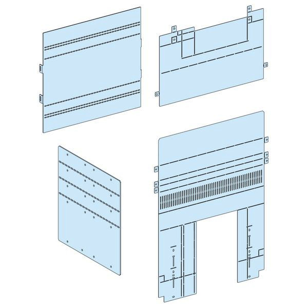 PrismaSeT P. Abdeckung der vorderseitigen Anschlüsse eines ComPacT NS630b-1600 A in vertikaler Einbaulage in Einschubtechnik, oder eines MasterPacT MTZ2 08 bis 32 in vertikaler Einbaulage in Festeinbautechnik oder Einschubtechnik. Pulverbeschichtet in RAL9003 struktur.