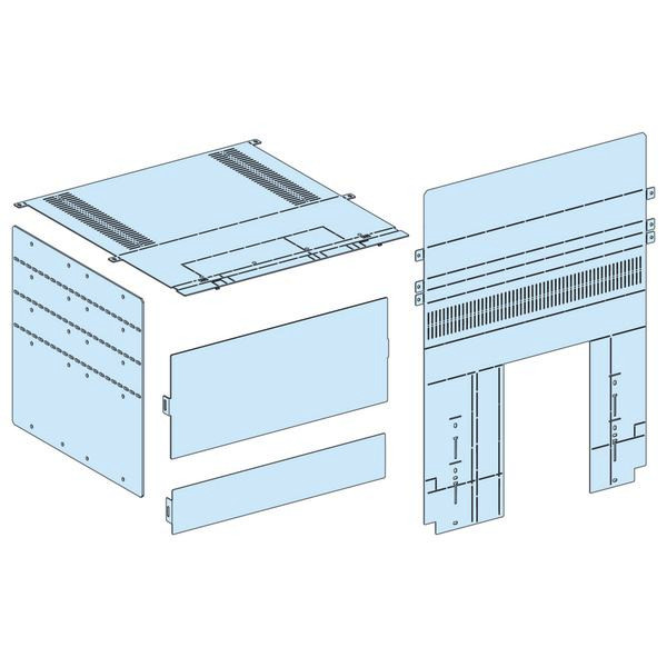 PrismaSeT P. Abdeckung der rückseitigen Anschlüsse eines ComPacT NS630b-1600 A in vertikaler Einbaulage in Einschubtechnik, oder eines MasterPacT MTZ2 08 bis 32 in vertikaler Einbaulage in Festeinbautechnik oder Einschubtechnik. Pulverbeschichtet in RAL9003 struktur.