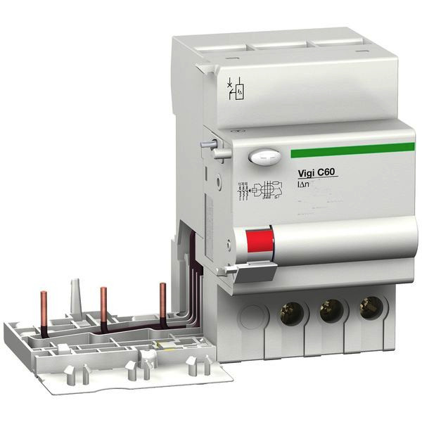 Fehlerstromschutzschalter Vigi C60 Multi 9 OEM, 30mA. 3-polig, Nennstrom 63A, Typ AC, Betriebsspannung (Ue) 400-415V, Isolationsspannung (Ui) 500V AC. Vigi C60 Fehlerstromschutzblöcke für C60 bieten Schutz gegen Stromschlag durch direkte und indirekte Berührung und Brandschutz bei Isolationsfehlern. Technologie der Auslöseeinheit- Differenzstrom. An Leitungsschutzschalter, die mit einem Vigi-Modul kombiniert werden, kann weiterhin zusätzliches Zubehör angebaut werden. Zusätzlich anreihbare Hilfsmodule (optional)- Anzeige von Schaltstellung (OF), Fehlerauslösung (SD), Arbeitsstromauslöser (MX, MX+OF), Unterspannungsauslöser (MN, MNs, MNx). Werkzeuglose Montage linksseitig am Gerät. Der Vigi C60 Fehlerstromschutzschalter erfüllt folgende Normen- IEC/EN 61009-1.