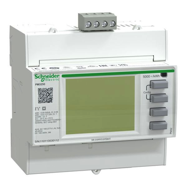 Schnittstelle Modbus RTU (RS485) PowerLogic PM3250 Universalmessgerät für DIN Montage mit einem hintergrundbeleuchteten LCD Display (128 x 96 Pixel). Das Messgerät bietet eine Genauigkeit der Klasse 0,5s gemäß der Norm IEC 62053-22 und 32 Abtastungen pro Zyklus. Das Messgerät misst Energie, Wirk- und Blindleistung, Spannung, Strom, Frequenz, Leistungsfaktor, Scheinleistung, Gesamtharmonische Verzerrung und bis zur 15ten Harmonischen. Mit 4 Quadranten Energiemessung. Das Messgerät funktioniert in einem 50Hz oder 60Hz Netz und akzeptiert eine Versorgungsspannung von 100 bis 277VAC, 173 bis 480VAC und 100 bis 300VDC. Der Bemessungsstrom für dieses Messgerät beträgt 1 A oder 5 A und unterstützt einphasige, einphasige und neutrale oder dreiphasige Konfigurationen. Der direkte Messbereich beträgt 50 bis 570VAC, mit einem externen Spannungswandler 570 bis 999000VAC. Der Bereich der Messspannung zwischen den Phasen beträgt 80 bis 570 VAC bei 45 bis 65 Hz. Der Messbereich zwischen Phase und Neutralleiter beträgt 50 bis 330VAC bei 45 bis 65 Hz. Das Kommunikationsprotokoll ist Modbus RTU und ASCII 2 Drähte mit RS485 Anschluss. Das Messgerät bietet eine Ereignisaufzeichnung mit bis zu 5 Alarmen. Die Produktabmessungen sind wie folgt: Breite 90 mm, Tiefe 70 mm, Höhe 95 mm und Produktgewicht 260 g.