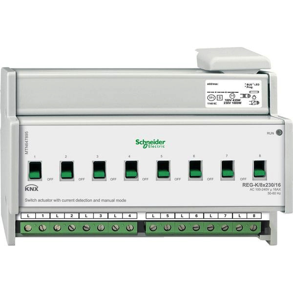 Schneider Electric KNX. Zum unabhängigen Schalten von 8 Verbrauchern über Schließerkontakte. Der Aktor verfügt über eine integrierte Stromerkennung, die den Lastrom je Kanal misst. Alle 230 V-Schaltausgänge lassen sich mit Handschaltern manuell betätigen. Mit integriertem Busankoppler. Eine grüne LED zeigt nach dem Laden der Applikation die Betriebsbereitschaft an. Der Lastanschluss erfolgt über Schraubklemmen. Für die Montage auf Hutschienen TH35 nach EN 60715. Der Busanschluss erfolgt über eine Busanschlussklemme. Nennspannung: AC 230 V, 50-60 Hz. DC 12-24 V +/-10%, 0,1-16 A. Je Schaltkontakt: Schaltstrom: 16 A, cos Phi 0,6, Erfassungsgenauigkeit: +/- 8% des aktuellen Stromwertes (sinus) und +/- 100 mA. Frequenz: 50/60 Hz bei Wechselspannung. Darstellung: 100 mA. Gerätebreite:8 TE entspricht ca 144 mm, Lieferumfang: Mit Busanschlussklemme und Leitungsabdeckung.