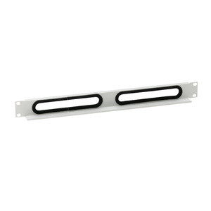 An den 19-Zoll-Schienen befestigte Frontplatte mit Öffnungen und Halterungen für das Kabelmanagement. Stahlblech, RAL7035, lichtgrau. 1HE hohe Platte. Produktfamilie Actassi.