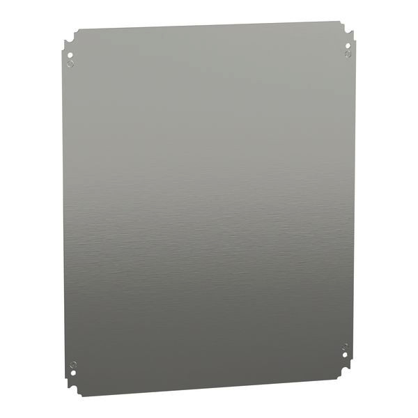 Glatte Montageplatte für PanelSeT CRN, S3D, S3X, PLM. Für Gehäuse H600 x B500 mm. Universelles Montagezubehör. Montageort des Stufenschlittens oder direkte Befestigung an den Hinterlegern (Schrauben M8). 90 Kg zulässige Last. Verzinkter Stahl. Satz von 1.
