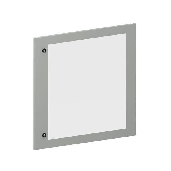 PanelSeT SF transparente Tür. Teilsichttür. Montage an der Vorderseite. 3 Schlösser und 3 mm Doppelbarteinsatz-System. Umkehrbare 120° Türöffnungsseite. Sicherheitsglas und Stahlblech für die Tür. Grau RAL 7035. Teiltür, 2 vertikale Verstärkungsrahmen, 3 Scharniere inkl.