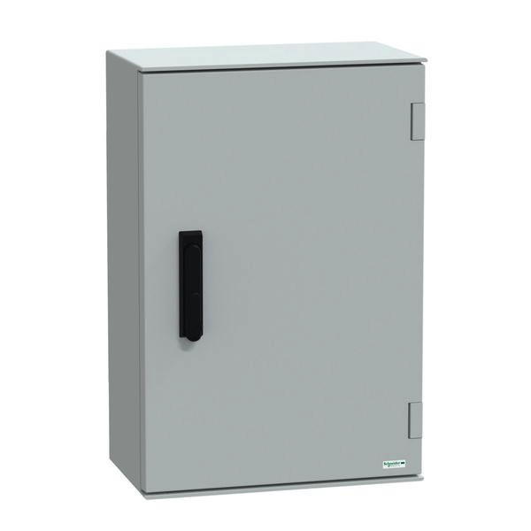 | Kurzbeschreibung | PanelSeT PLM Polyestergehäuse - Wandmontage, einfache Tür, mit Griff ohne MP H647xB436xT250mm IP66, IK10, RAL 7035 |