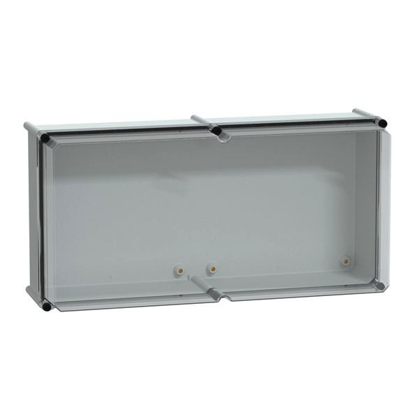PanelSeT PLS Box Polyester Rückseite mit transparenter PC-Abdeckung. Isolierende Modulbox. Einteiliger Formkörper. Wandmontage. Hochtransparente Abdeckung, Deckelverriegelungsschraube abnehmbar. Polyester verstärkt mit Glasfaserrückseite, Polycarbonatabdeckung. Grau RAL 7035. IP65, IK09, NEMA (13,4X) 960°C Feuerbeständigkeit. Isolationsklasse II.