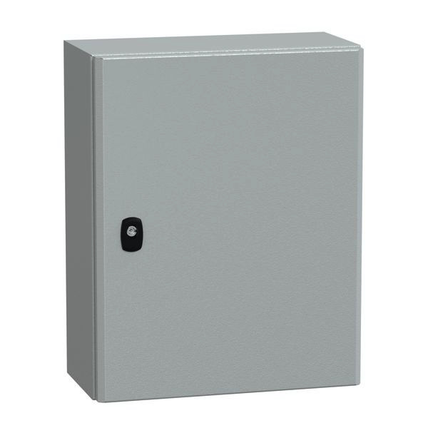 PanelSeT S3D Wandgehäuse aus Stahl mit glatter Tür. Einteiliges Gehäuse, inkl. Montageplatte. 3 mm Doppelstabschloss-Einsatz. Aus Stahl, Epoxid-Polyester-Pulverlackierung. Schutzart IP 66, IK10, Grau RAL 7035.