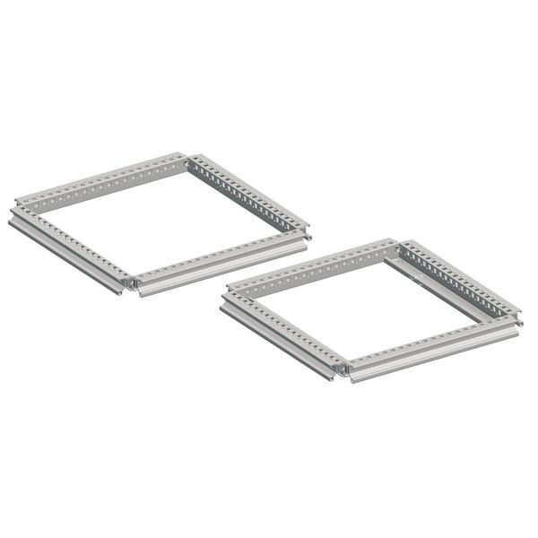 Spacial SF Dach- und Bodenrahmen. 800 x 800 mm. Zur Montage an der Unter- oder Oberseite der vertikalen Rahmenprofile. Mit Anschraubflächen für Seiten- und Rückwände sowie Dach- und Sockelbleche. Aus Stahl, Epoxid-Polyester-Pulverbeschichtung. Befestigung durch direktes Verschrauben mit dem Rahmenprofil.