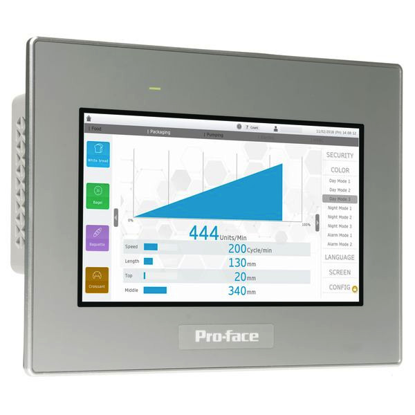 Das Basic HMI ST6000 ist ein Standard Touch-Panel aus der Pro-face ST6000-Reihe. Diese Produkt-Reihe wurde entwickelt, um die Anforderungen an die Bedienerschnittstelle einfacher Maschinen zu erfüllen. Hierbei stehen Konnektivität, Cybersicherheit für den Fernzugriff mit Pro-face Connect und eine moderne und intuitive Visualisierung im Mittelpunkt. Das resistive Single-Touch Display in 7 Zoll wide screen mit 16 Mio Farben und einer Auflösung von 800x480 Pixel dient der Visualisierung, Bedienung und Statusanzeige ihrer Anwendungen. Die Bedienoberfläche auf dem HMI wird mit der Software BLUE konfiguriert. Durch die vielfältigen Schnittstellen (2 x Ethernet (dual IP), 2 x serielle COM, 1 x USB Typ A, 1 x USB micro-B) ist eine optimale Konnektivität gewährleistet. Die äußeren Abmessungen des Displays betragen 208 mm (Breite) x 153 mm (Höhe) x 45 mm (Tiefe) bei einem Panel Cut-out von 190 mm x 135 mm und einer Tafeldicke von 1,6 bis 5 mm. Das Produkt entspricht der Schutzklasse IP65F, Typ 1, Typ 4X (nur für den Innenbereich), Typ 12 und Typ 13 (bei ordnungsgemäßer Installation in einem Gehäuse). Zudem entspricht es Normen wie CE, China RoHS, REACH,KC, EN (61000-6-4/61000-6-2/ 61131-2), UL 61010-2-201, CSA C22.2 No 61010-2-201.