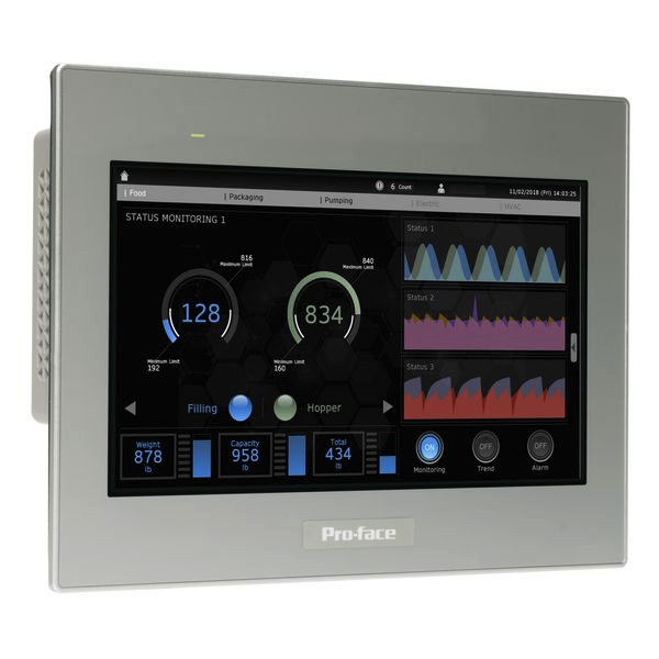 Das Basic HMI ST6000 ist ein Standard Touch-Panel aus der Pro-face ST6000-Reihe. Diese Produkt-Reihe wurde entwickelt, um die Anforderungen an die Bedienerschnittstelle einfacher Maschinen zu erfüllen. Hierbei stehen Konnektivität, Cybersicherheit für den Fernzugriff mit Pro-face Connect und eine moderne und intuitive Visualisierung im Mittelpunkt. Das resistive Single-Touch Display in 10 Zoll wide screen mit 16 Mio Farben und einer Auflösung von 1024x600 Pixel dient der Visualisierung, Bedienung und Statusanzeige ihrer Anwendungen. Die Bedienoberfläche auf dem HMI wird mit der Software BLUE konfiguriert. Durch die vielfältigen Schnittstellen (2 x Ethernet (dual IP), 2 x serielle COM, 1 x USB Typ A, 1 x USB micro-B) ist eine optimale Konnektivität gewährleistet. Die äußeren Abmessungen des Displays betragen 273 mm (Breite) x 203 mm (Höhe) x 47 mm (Tiefe) bei einem Panel Cut-out von 255 mm x 185 mm und einer Tafeldicke von 1,6 bis 5 mm. Das Produkt entspricht der Schutzklasse IP65F, Typ 1, Typ 4X (nur für den Innenbereich), Typ 12 und Typ 13 (bei ordnungsgemäßer Installation in einem Gehäuse). Zudem entspricht es Normen wie CE, China RoHS, REACH,KC, EN (61000-6-4/61000-6-2/ 61131-2), UL 61010-2-201, CSA C22.2 No 61010-2-201.
