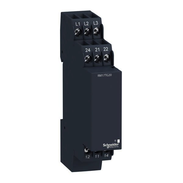 Harmony Control. Dieses Netzüberwachungsrelais überwacht Drehstromnetze auf Phasenfolge und Phasenausfall. Zur Meldung sind zwei Relaiswechsler vorhanden, der bis 5 A belastbar ist. Eine LED zeigt den Status an. Die Baubreite beträgt 17,5 mm und die Montage erfolgt auf der Hutschiene. Versorgung aus dem Messkreis 208-440 VAC (50-60 Hz).
