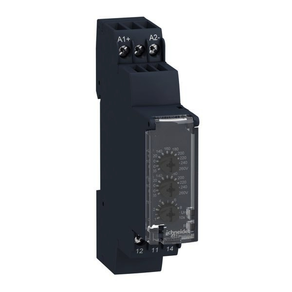 Harmony COntrol. Dieser Spannungsüberwachungsrelais überwacht einphasige Versorgungen 20-80 VAC/DC (50-60 Hz) auf Über- und Unterschreitung eines einstellbaren Grenzwertes im Fenstermodus. Zur Meldung ist ein Relaiswechsler vorhanden, der bis 5 A belastbar ist. Der untere und obere Grenzwert und eine Abschaltverzögerung sind einstellbar. Die Einstellungen erfolgen über Bedienelemente in der Front, die unter einer Klarsichtabdeckung gegen Veränderungen geschützt werden können. Zwei LEDs zeigt den Status an. Die Energieversorgung des Gerätes wird der Messspannung entnommen (Nennspannung 24-48 VAC/DC, 50-60 Hz). Die Baubreite beträgt 17,5 mm und die Montage erfolgt auf der Hutschiene.