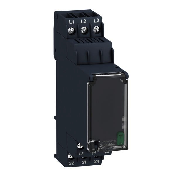 Harmony Control. Dieses Netzüberwachungsrelais überwacht Drehstromnetze (208-480 VAC) auf Phasenfolge und Phasenausfall. Zur Meldung sind zwei Relaiswechsler vorhanden, die bis 8 A belastbar ist. Der frontseitige Diagnoseschalter ermöglicht das Ausschalten der Ausgangsrelais zum Test der Gesamtanwendung. Mit dem Schließen der Klarsichtabdeckung wird der Diagnoseschalter automatisch zurückgesetzt. Zwei LEDs zeigt den Status an. Die Baubreite beträgt 22,5 mm und die Montage erfolgt auf der Hutschiene. Der Leitungsanschluss erfolgt über Schraubklemmen.
