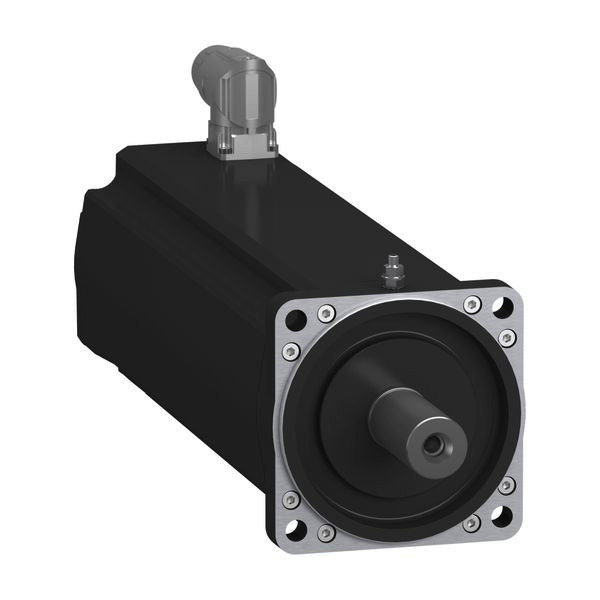 SH3-Servomotor für Lexium 52 & Lexium 62. Synchronmotor, niedriges Trägheitsmoment. Baugröße 100 mm - Nennleistung <=2600 W. Moment Dauerstillstand/Spitze 10/40,5 Nm. Drehzahl Nenn/Max <=3600/6000 U/min. Wellenende glatt in IP65 - Gehäuse IP65. Singelturn Encoder DSL, SinCos, 18x1024. Haltebremse integriert und Wellendurchmesser von 19 mm. Anschluss mit 1 Kabel, 90° gewinkelt, drehbar. 2x M23.