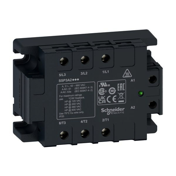 Die Baureihe Harmony SSP3 umfasst Halbleiterrelais mit 3 Phasen und ist z.B. ausgelegt für den Einsatz im Maschinenbau, Verpackungs-und Textilindustrie, HVAC, Nieder-/Mittelspannungsschaltanlagen oder in Gebäuden. Dieses Halbleiterrelais ist nullspannungsschaltend und damit ideal geeignet für ohmsche und induktive Lasten. Der Lastkreis ist für 3-phasige Netze im Bereich von 42-660V AC ausgelegt und es können je Phase 25 A geschaltet werden. Die Ansteuerungsspannung erfolgt mit 90-280V AC und schaltet alle 3 Phasen. Das Halbleiterrelais schaltet geräuschlos, zuverlässig und hat eine längere Lebensdauer, da es keine beweglichen Kontakte hat. Eine LED-Anzeige informiert über die Ansteuerung. Die werkseitig montierte Wärmeableitfolie ermöglicht eine schnelle, einfache und saubere Montage, da keine Wärmeleitpaste oder Pads benötigt werden. Durch den niedrigen internen Spannungsabfall wird die Verlustleistungswärme reduziert. Zur Auswahl des separaten Kühlkörpers ist eine Wärmebetrachtung durchzuführen. Aufgrund der Vielzahl von vorhandenen Produktstandards und Zertifizierungen geeignet für den internationalen Einsatz. Dank des Green Premium Umweltzeichens können Sie detaillierte Informationen zu Materialinhalten, Umweltauswirkungen und Kreislaufwirtschaft erhalten, die Ihre Nachhaltigkeitsziele unterstützen.