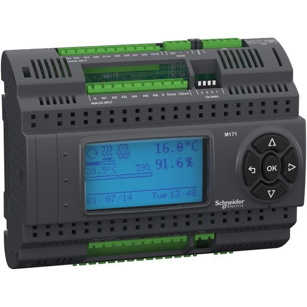 Die SPS-Steuerung Modicon M171 in Performance Ausführung ist für einfache und kompakte Applikationen aus dem Bereich HLK-Maschinen und Pumpenautomatisierung ausgelegt. Verschiedene Scchnittstellen ermöglichen die Vernetzung z.B. mit GLT-Systemen. Mit dem integriertem Display und Tasten lassen sich Steuerungsparametern direkt am Gerät einstellen. Insgesamt 27 integrierte E/A, davon 8 digitale und 6 konfigurierbare (U/I/T/R) analoge Eingänge, 7 digitale und 5 konfigurierbare (U/I) analoge Ausgänge. Integrierte Modbus SL Schnittstelle die auch Remote-Download ermöglicht. Die Spannungsversorgung erfolgt über 24 VAC / 24 VDC oder 48 VDC. Die digitalen Ausgänge sind als Relais (2x 8A / 230VAC und 2x 5A / 230VAC)ausgeführt. Die Anschlüsse erfolgen mittels abnehmbaren Schraubklemmleisten (nicht im Lieferumfang enthalten). Montage auf 35mm Hutschiene. Wird mit kostenfreier Software EcoStruxure Machine Expert - HVAC programmiert.