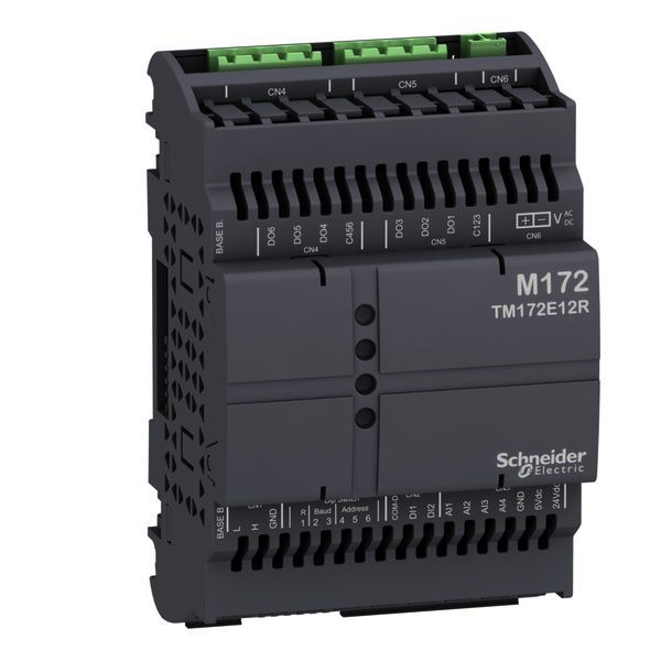 E/A-Erweiterungsmodul für Modicon M172 SPS-Steuerungen. Das Modul verfügt über insgesamt 12 integrierte E/A, davon 2 digitale (potenzialfrei / HSC) und 4 konfigurierbare (U/I/T/R) analoge Eingänge, 6 digitale Ausgänge. Die Spannungsversorgung erfolgt über 24 VAC / 24 VDC. Die digitalen Ausgänge sind als Relais (SPST, 3A) ausgeführt. Die Anschlüsse erfolgen mittels abnehmbaren Schraubklemmleisten (nicht im Lieferumfang enthalten). Montage auf 35mm Hutschiene. Zertifiziert nach CE, cURus (UL recognized), CSA, EAC, RCM.