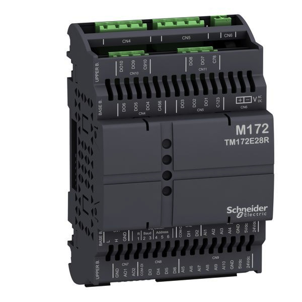 E/A-Erweiterungsmodul für Modicon M172 SPS-Steuerungen. Das Modul verfügt über insgesamt 28 integrierte E/A, davon 6 digitale (potenzialfrei / HSC) und 10 konfigurierbare (U/I/T/R) analoge Eingänge, 10 digitale & 2 konfigurierbare (U/I/PWM) analoge Ausgänge. Die Spannungsversorgung erfolgt über 24 VAC / 24 VDC. Die digitalen Ausgänge sind als Relais (SPST, 3A) ausgeführt. Die Anschlüsse erfolgen mittels abnehmbaren Schraubklemmleisten (nicht im Lieferumfang enthalten). Montage auf 35mm Hutschiene. Zertifiziert nach CE, cURus (UL recognized), CSA, EAC, RCM.