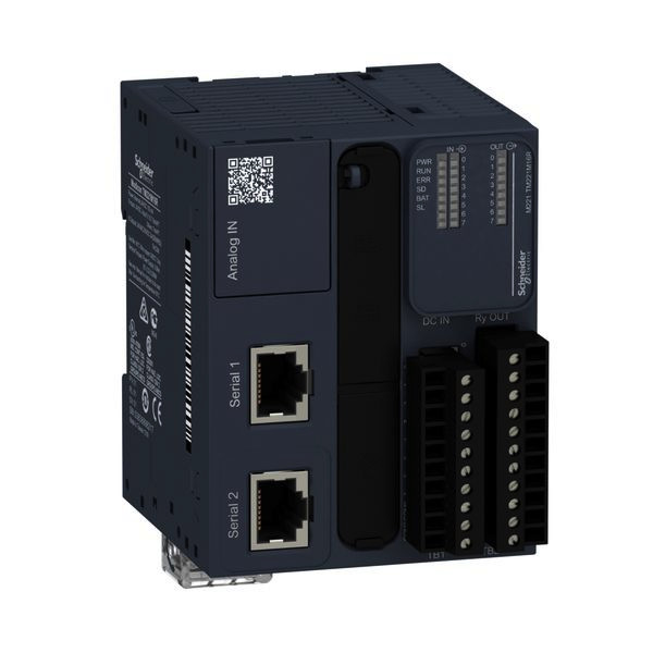 SPS-Steuerung Modicon M221 im Kompaktformat mit 0,2µs / boolsche Anweisung für die Automatisierung von einfachen industriellen Maschinen. Insgesamt 16 integrierte E/A, davon 8 digitale (4 Standard mit 5kHz und 4 HSC mit 100kHz) Eingänge, 8 digitale Ausgänge. Zusätzlich 2 analoge (0V bis 10V / 10Bit) Eingänge. Zwei RS485/RS232-Schnittstellen mit RJ45-Buchse für Modbus ASCII/RTU Master/Slave, ASCII character string, Modbus Serial IO Scanner. Die Spannungsversorgung erfolgt über 24VDC. Die digitalen Ausgänge sind als Relais (2A) ausgeführt. 640 kB integrierter RAM-Speicher und 2 MB Flash-Speicher. Integrierte Regelung für bis zu 2 koordinierte Achsen. Position Control (PTO) mit Trapez- oder S-Profil für 2 Achsen in Pulse-Direction (P/D)-Mode oder eine Achse in CW/CCW-Mode. Ausgestattet mit einem Steckplatz für SD-Karte, einem USB-mini-B-Port zur Programmierung, einem Run/Stop-Schalter und QR-Code für direkten Zugriff auf technische Dokumentation. Lokale und dezentrale E/A-Erweiterung mit Modicon TM3 E/A-System. Programmierung und Konfiguration mittels kostenfreier Software EcoStruxure Machine Expert - Basic (Download über www.se.com). SPS-Programmierung nach IEC 61131-3 in den Programmiersprachen Anweisungsliste (AWL), Kontaktplan (KOP) oder Ablaufsprache (Grafcet Liste/ SFC). Anschluss über abnehmbare Schraubklemmleiste. Umgebungstemperatur im Betrieb -15°C bis +50°C. Montage auf 35mm DIN-Hutschiene oder direkt auf Schalttafel. Zertifiziert nach CE, cULus Listing Mark, CSA, RCM, EAC, LR, ABS, DNV-GL, cCSAus Gefahrenzone.