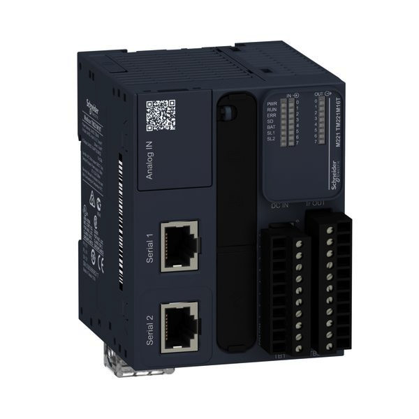 SPS-Steuerung Modicon M221 im Kompaktformat mit 0,2µs / boolsche Anweisung für die Automatisierung von einfachen industriellen Maschinen. Insgesamt 16 integrierte E/A, davon 8 digitale (4 Standard mit 5kHz und 4 HSC mit 100kHz) Eingänge, 8 digitale Ausgänge. Zusätzlich 2 analoge (0V bis 10V / 10Bit) Eingänge. Zwei RS485/RS232-Schnittstellen mit RJ45-Buchse für Modbus ASCII/RTU Master/Slave, ASCII character string, Modbus Serial IO Scanner. Die Spannungsversorgung erfolgt über 24VDC. Die digitalen Ausgänge sind als Source-Transistor (0,5A) ausgeführt. 640 kB integrierter RAM-Speicher und 2 MB Flash-Speicher. Integrierte Regelung für bis zu 2 koordinierte Achsen. Position Control (PTO) mit Trapez- oder S-Profil für 2 Achsen in Pulse-Direction (P/D)-Mode oder eine Achse in CW/CCW-Mode. Ausgestattet mit einem Steckplatz für SD-Karte, einem USB-mini-B-Port zur Programmierung, einem Run/Stop-Schalter und QR-Code für direkten Zugriff auf technische Dokumentation. Lokale und dezentrale E/A-Erweiterung mit Modicon TM3 E/A-System. Programmierung und Konfiguration mittels kostenfreier Software EcoStruxure Machine Expert - Basic (Download über www.se.com). SPS-Programmierung nach IEC 61131-3 in den Programmiersprachen Anweisungsliste (AWL), Kontaktplan (KOP) oder Ablaufsprache (Grafcet Liste/ SFC). Anschluss über abnehmbare Schraubklemmleiste. Umgebungstemperatur im Betrieb -15°C bis +50°C. Montage auf 35mm DIN-Hutschiene oder direkt auf Schalttafel. Zertifiziert nach CE, cULus Listing Mark, CSA, RCM, EAC, LR, ABS, DNV-GL, cCSAus Gefahrenzone.