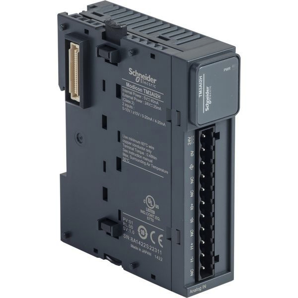Analoges Eingangsmodul Modicon TM3. Zur Erweiterung von Modicon M221, M241, M251 und M262 SPS-Steuerungen mit E/A-Kanälen. Kompatibel mit Drittanbieter-Steuerungen mittels Modicon TM3 Buskoppler. Insgesamt 2 analoge Eingänge (-10V bis +10V / 0V bis 10V / 0mA bis 20mA / 4mA bis 20mA) mit 16Bit Auflösung. Projektierung und Konfiguration mittels Software EcoStruxure Machine Expert oder Standalone Konfigurator (Download über www.se.com). Anschluss über abnehmbare Schraubklemmleisten mit Rasterabstand 5,08mm. Umgebungstemperatur im Betrieb -10°C bis +55°C. Montage auf 35mm DIN-Hutschiene oder direkt auf Schalttafel mit optionalem Halter. Zertifizierungen nach CE, cULus/CSA, EAC, RCM, cULus Hazardous Location.