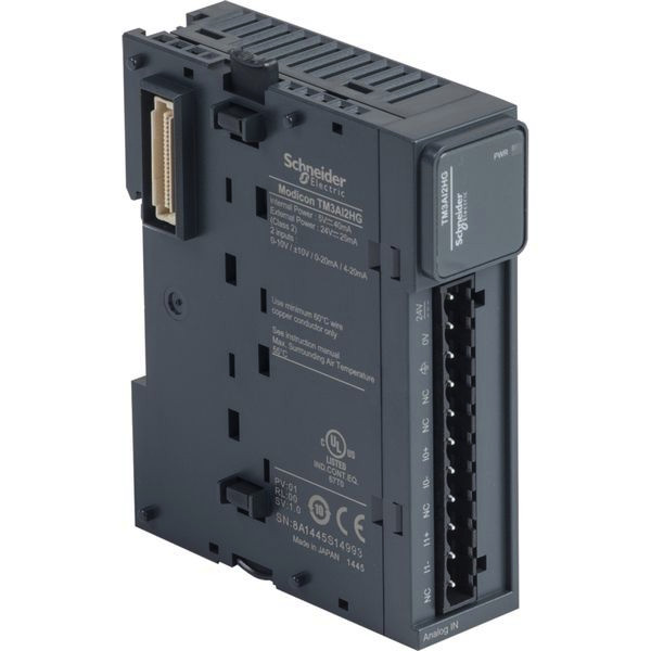 Analoges Eingangsmodul Modicon TM3. Zur Erweiterung von Modicon M221, M241, M251 und M262 SPS-Steuerungen mit E/A-Kanälen. Kompatibel mit Drittanbieter-Steuerungen mittels Modicon TM3 Buskoppler. Insgesamt 2 analoge Eingänge (-10V bis +10V / 0V bis 10V / 0mA bis 20mA / 4mA bis 20mA) mit 16Bit Auflösung. Projektierung und Konfiguration mittels Software EcoStruxure Machine Expert oder Standalone Konfigurator (Download über www.se.com). Anschluss über abnehmbare Federzugklemmleisten mit Rasterabstand 5,08mm. Umgebungstemperatur im Betrieb -10°C bis +55°C. Montage auf 35mm DIN-Hutschiene oder direkt auf Schalttafel mit optionalem Halter. Zertifizierungen nach CE, cULus/CSA, EAC, RCM, cULus Hazardous Location.