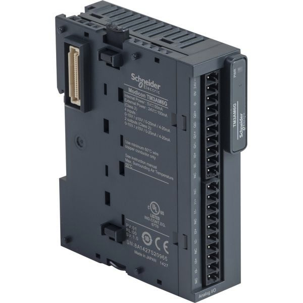 Analoges Ein-/Ausgangsmodul Modicon TM3. Zur Erweiterung von Modicon M221, M241, M251 und M262 SPS-Steuerungen mit E/A-Kanälen. Kompatibel mit Drittanbieter-Steuerungen mittels Modicon TM3 Buskoppler. Insgesamt 6 analoge E/A, davon 4 Eingänge (-10V bis +10V / 0V bis 10V / 0mA bis 20mA / 4mA bis 20mA) mit 12Bit Auflösung, 2 Ausgänge (-10V bis +10V / 0V bis 10V / 0mA bis 20mA / 4mA bis 20mA) mit 12Bit Auflösung. Projektierung und Konfiguration mittels Software EcoStruxure Machine Expert oder Standalone Konfigurator (Download über www.se.com). Anschluss über abnehmbare Federzugklemmleisten mit Rasterabstand 3,81mm. Umgebungstemperatur im Betrieb -10°C bis +55°C. Montage auf 35mm DIN-Hutschiene oder direkt auf Schalttafel mit optionalem Halter. Zertifizierungen nach CE, cULus/CSA, EAC, RCM, cULus Hazardous Location.