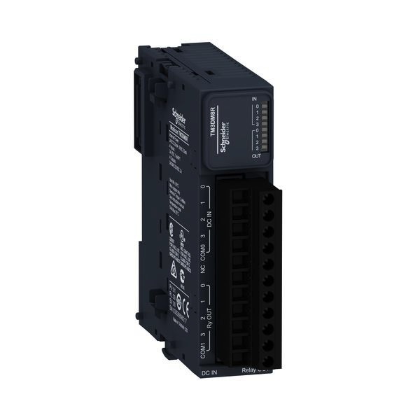 Digitales Ein-/Ausgangsmodul Modicon TM3. Zur Erweiterung von Modicon M221, M241, M251 und M262 SPS-Steuerungen mit E/A-Kanälen. Kompatibel mit Drittanbieter-Steuerungen mittels Modicon TM3 Buskoppler. Insgesamt 24 E/A, davon 4 digitale Eingänge, 4 digitale Ausgänge. E/A-Kanäle mit 24VDC Eingangsspannung, 24VDC/240VAC Ausgangsspannung. Die digitalen Ausgänge sind als Relais (2A) ausgeführt. Konfigurierbarer Eingangsfilter für verbesserte Erfassungsgeschwindigkeit des Signals oder zur Reduzierung von Rauscheffekten. Konfigurierbare Latching-Funktion zum Erfassen von Impulsen mit kürzerer Amplitudenbreite als der Abtastzeit der Steuerung. Konfigurierbarer Fallback-Modus zum Setzen von Ausgängen in konfigurierten Zustand (0 / 1 / Halten) im Falle eines Hardwarefehlers. Projektierung und Konfiguration mittels Software EcoStruxure Machine Expert oder Standalone Konfigurator (Download über www.se.com). Anschluss über abnehmbare Schraubklemmleisten mit Rasterabstand 5,08mm. Umgebungstemperatur im Betrieb -10°C bis +55°C. Montage auf 35mm DIN-Hutschiene oder direkt auf Schalttafel mit optionalem Halter. Zertifizierungen nach CE, cULus/CSA, EAC, RCM, cULus Hazardous Location.