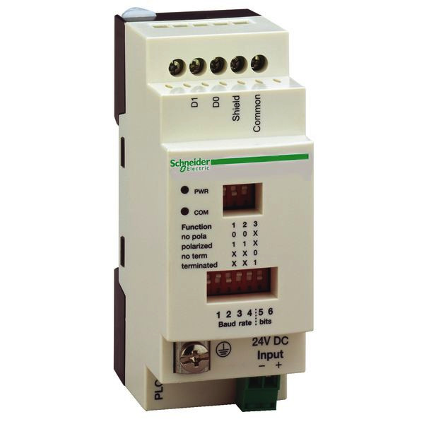 Verkabelungssystem Modbus Serielle Verbindung. Anschluss- und Anpassungskomponenten für die serielle Schnittstelle RS 485. Abzweigdose, Klemmenleiste für Hauptkabel, 1 RJ45-Stecker für Abzweigung,Galvanische Trennung der seriellen Schnittstelle RS 485, Endanpassung (R 120 ?, C 1 nF). Vorpolarisierung der Leitung (2 R 620 ?), Versorgung c 24 V, Montage auf 7 35 mm.