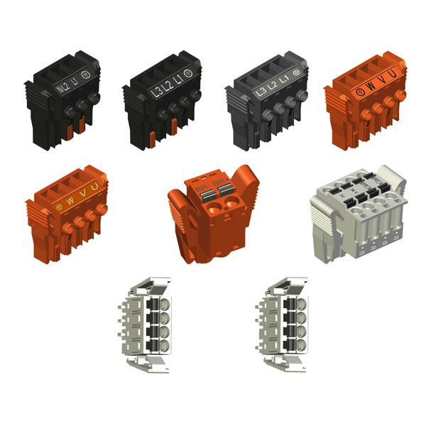 Zubehör für Servoverstärker Lexium LXM32 Modular. Dieses Set beinhaltet verschiedene Steckverbinder für den Geräteanschluss. 4x Netzversorgung, 2x Ein-/Ausgänge, 2 Leistungsversorgung des Servos, 1x Haltebremse.
