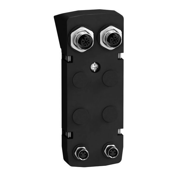 Anschlussmodul für den integrierter Servoantrieb der Reihe Lexium 32i. Dieser integrierte Servoantriebe bietet Ihnen ein modulares Konzept aus Antriebseinheit, Steuereinheit und Anschlussmodulen an, das entsprechend der jeweiligen Anwendungen zusammengesteckt wird. Dieses Anschlussmodul stellt 2 digitale Eingänge an M8-Steckverbindern zur Verfügung. Die Eingänge sind in negativer Logik (Sink) ausgeführt. Dieses Anschlussmodul setzt die Steuereinheit für EtherCat oder Ethernet (PROFINET) an der BMI-Antriebseinheit voraus. Der Busanschluss erfolgt über 2x M12-Steckverbinder.