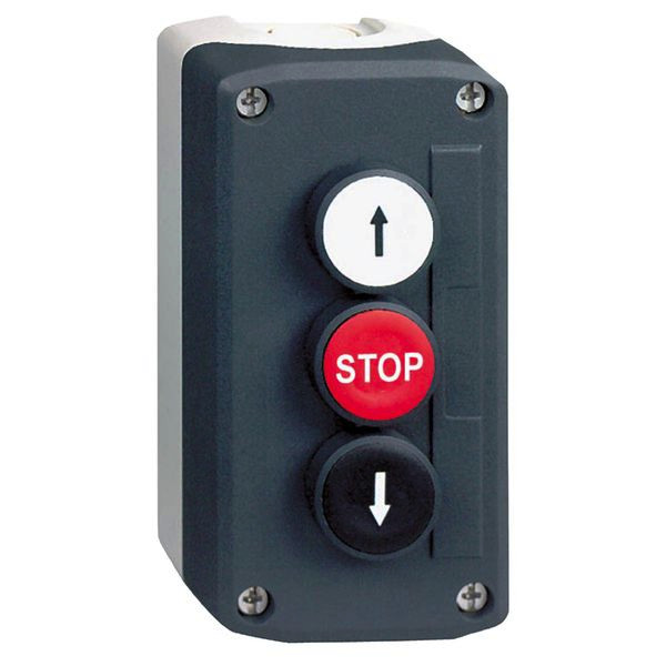 | Kurzbeschreibung | Aufbaugehäuse, Harmony XALD, Kunststoff, dunkelgrau, 3 Drucktaster, STOP, Pfeile Auf-Ab, 22mm, 2S+1Ö |