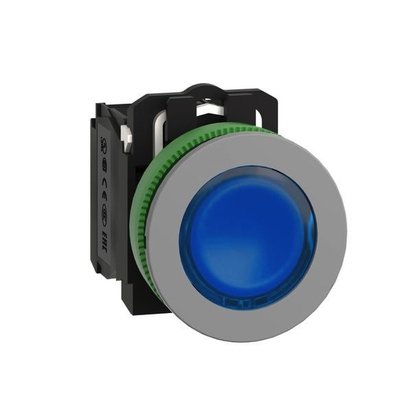 Die Baureihe Harmony XB5F aus Kunststoff bietet eine Vielzahl an 30mm Komplettgeräten wie Drucktaster, Leuchtmelder und Wahlschalter bis hin zum Not-Aus-Schalter. Zusätzlich ist es durch den modularen Aufbau der Geräte möglich, alle Bestandteile auch als Einzelelemente zu beziehen sowie wahlweise auch für 22mm Einbaumaß. Aufgrund der Qualität, der Flexibilität und der extremen Robustheit (Schutzklassen bis IP69K) eignen sich die Geräte ideal für die meisten Anwendungen in der Industrie und in Gebäuden. Dieser Leuchtdrucktaster in der Farbe blau beinhaltet eine universelle LED und benötigt eine Versorgungsspannung von 24V ACDC. Der Taster verfügt über 1 Schließer und 1 Öffner. Montiert in einer 30mm Bohrung erfolgt der Anschluss des Geräts durch Schraubklemmen auf der Rückseite des Produkts. Der Außenring des Frontelements ist hellgrau beschichtet. Aufgrund der Vielzahl von vorhandenen Produktstandards und Zertifizierungen geeignet für den internationalen Einsatz. Dank des Green Premium Umweltzeichens können Sie detaillierte Informationen zu Materialinhalten, Umweltauswirkungen und Kreislaufwirtschaft erhalten, die Ihre Nachhaltigkeitsziele unterstützen.
