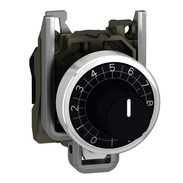 Die Baureihe Harmony XB4/ZB4 aus Metall bietet eine Vielzahl an 22mm und 30mm Befehls- und Meldegeräten wie Drucktaster, Leuchtmelder und Wahlschalter bis hin zum Not-Aus-Schalter. Durch den modularen Aufbau der Geräte ist es möglich, alle Bestandteile als Einzelelemente, in Baugruppen oder als Komplettgeräte zu beziehen. Aufgrund der Qualität, der Flexibilität und der extremen Robustheit (Schutzklassen bis IP69K) eignen sich die Geräte ideal für die meisten Anwendungen in der Industrie und in Gebäuden. Dieses ergonomische Potentiometer Frontelement in der Farbe schwarz für 45-50mm Achslänge und 6,35mm Achsen. Das Frontelement wird in einer Bohrung von 22mm montiert. Die Befestigung erfolgt durch eine erschütterungsfeste Anschlussschraube. Um ein vollständiges Komplettgerät zu schaffen, kann dieses Frontelement mit einem Befestigungsflansch sowie einer Vielzahl an verschiedenen Hilfsschaltern und Zubehör kombiniert werden. Neben hoher Vibrationsbeständigkeit und sehr langer Lebensdauer bestechen die Geräte der Baureihe XB4/ZB4 zusätzlich durch eine extrem hohe mögliche Umgebungstemperatur. Aufgrund der Vielzahl von vorhandenen Produktstandards und Zertifizierungen geeignet für den internationalen Einsatz. Dank des Green Premium Umweltzeichens können Sie detaillierte Informationen zu Materialinhalten, Umweltauswirkungen und Kreislaufwirtschaft erhalten, die Ihre Nachhaltigkeitsziele unterstützen.