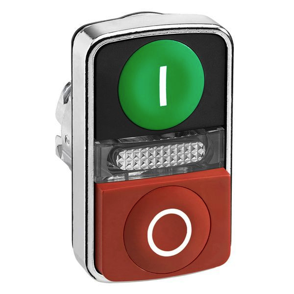 | Kurzbeschreibung | Doppeldrucktaster, Frontelement, Harmony XB4, Metall, 22mm, grün, rot vorstehend, beschriftet I/O, beleuchtet |