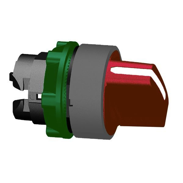Wahlschalter aus Kunststoff als Frontelement und 22mm Einbaumaß, Baureihe Harmony XB5. Farbe des Wahlschalters ist rot. Der Betätiger hat 2 Stellungen. Die Farbe des Außenrings ist grau. Die modularen Harmony Baureihen mit 22mm Einbaumaß kombinieren einfache Installation, Effizienz, modernes Design, Flexibilität mit höchster Robustheit. IP-Schutzklassen bis IP69K und Umgebungstemperaturen von -40°C bis +70°C. Produktstandards gem. EN/IEC 60947-5-1, EN/IEC 60947-5-4, CSA C22.2 No 14, UL 508, EN/IEC 60947-1, JIS C 4520. Zertifizierungen nach DNV, GL, UL gelistet, RINA, BV, CSA, LROS (Lloyds register of shipping). Produktstandards gem. EN/IEC 60947-5-1, EN/IEC 60947-5-4, CSA C22.2 No 14, UL 508, EN/IEC 60947-1, JIS C 4520.
