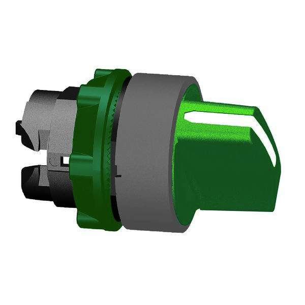 Wahlschalter aus Kunststoff als Frontelement und 22mm Einbaumaß, Baureihe Harmony XB5. Farbe des Wahlschalters ist grün. Der Betätiger hat 3 Stellungen. Die Farbe des Außenrings ist grau. Die modularen Harmony Baureihen mit 22mm Einbaumaß kombinieren einfache Installation, Effizienz, modernes Design, Flexibilität mit höchster Robustheit. IP-Schutzklassen bis IP69K und Umgebungstemperaturen von -40°C bis +70°C. Produktstandards gem. EN/IEC 60947-5-1, EN/IEC 60947-5-4, CSA C22.2 No 14, UL 508, EN/IEC 60947-1, JIS C 4520. Zertifizierungen nach DNV, GL, UL gelistet, RINA, BV, CSA, LROS (Lloyds register of shipping). Produktstandards gem. EN/IEC 60947-5-1, EN/IEC 60947-5-4, CSA C22.2 No 14, UL 508, EN/IEC 60947-1, JIS C 4520.
