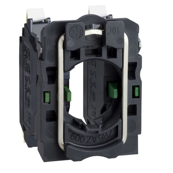 Hilfsschalterblock mit 2S Faston-Steckverbinder, Körper/Befestigungsflansch. Es gehört zur Baureihe Harmony XB5 mit einem Durchmesser von 22 mm, modularen Kunststoff-Drucktastern, Schaltern und Leuchtmelder.