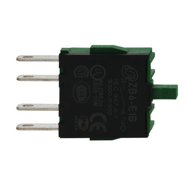 Hilfsschalterblock für Kopf, 1Ö Flachstecker. Es ist Teil der Baureihe Harmony XB6 mit einem Durchmesser von 16 mm, kompakte Kunststoffdrucktaster, Schalter und Leuchtmelder.