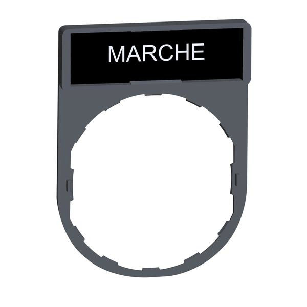 Kunststoff Schildträger 30x40mm kompatibel mit den 22mm Harmony Baureihen XB4 und XB5. Mit Schild und Beschriftung MARCHE. Die Farbe des Schildträgers ist grau. Die modularen Harmony Baureihen mit 22mm Einbaumaß kombinieren einfache Installation, Effizienz, modernes Design, Flexibilität mit höchster Robustheit.