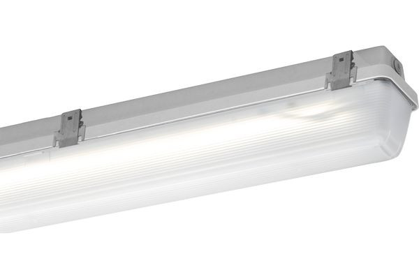 LED-Feuchtraum-Wannenleuchte, 49 W, 7440 lm, SKI, IP65, symmetrisch-breitstrahlend, 4000 K, Ra= 80, Ta -20 °C/+30 °C, L70>100000 h (@ Ta max), L80>70000 h (@ Ta max), L90>50000 h (@ Ta 25°C), Wanne PC satiniert, Verschluss Edelstahl (1.4571), Gehäuse glasfaserverstärktes Polyester, Farbe grau, für Lebensmittelbereiche (IFS), EAN/GTIN:4041254268774.Robuste LED-Feuchtraum-Wannenleuchte für Lebensmittelbereiche gem. International Featured Standard Food. Hochschlagfestes glasfaserverstärktes Polyestergehäuse, satinierte PC-Abschlusswanne mit hoher Schlagfestigkeit. Mehrteilige unverlierbare Edelstahlklammern, davon zwei Sicherheitsverschlüsse, Silikondichtung. Lackierter Aluminiumreflektor mit hocheffizienten Zhaga-konformen LED-Modulen und EVG mit Überlast- und Kurzschlussschutz.