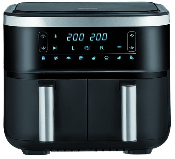 Heißluftfritteuse mit 2 individuell steuerbaren Frittierkörben je 3,8 l Fassungsvermögen mit Keramikbeschichtung, intuitive Touch-Bedienung mit 8 Automatik-Programmen mit LED-Display, einstellbare Temperaturregelung von 80 bis 200°C, mit Dörr-Funktion (40 bis 80°C), Timer, Abschaltautomatik beim Herausziehen des Korb-Einsatzes