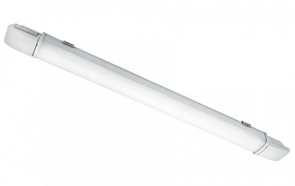 IP66 Leuchte zur Deckenmontage. Aus UV-stabilisiertem Polycarbonat. IK10. Schlankes Design, einzigartiger Einhand-Verriegelungsmechanismus an beiden Enden für eine sehr einfache und schnelle Installation. Möglichkeit zur Durchverdrahtung über Steckklemmen, 5x2,5mm².
